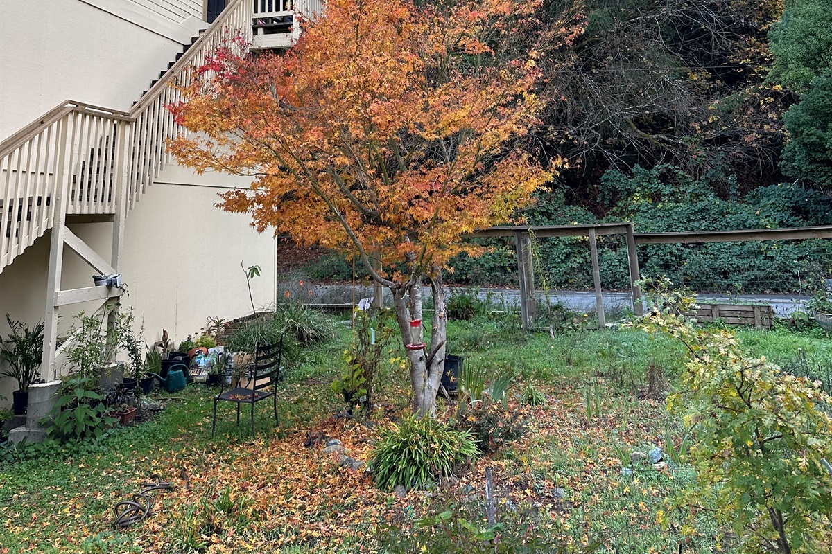 Step into your own sunny sanctuary within the expansive, fenced-in yard boasting fragrant roses, umbrellas, and comfortable patio furniture perfect for outdoor lounging and games. With two acres to explore and a tranquil creek nearby, there's endless fun to be had. Enjoy breakfast on the upper porch surrounded by majestic redwood trees, setting the scene for peaceful mornings.