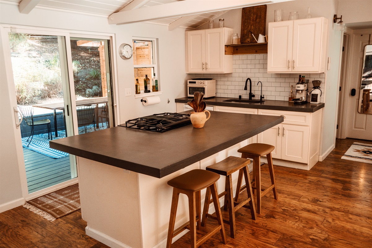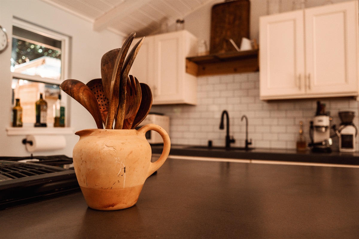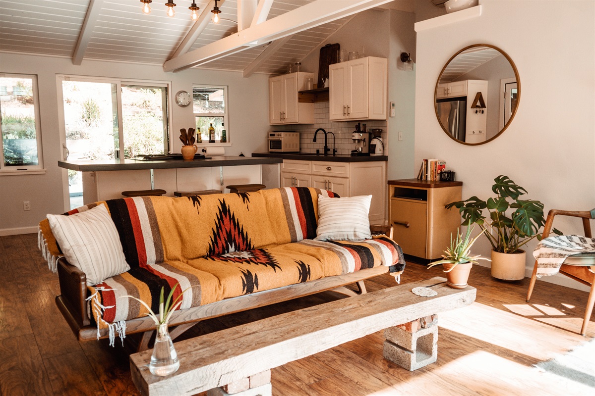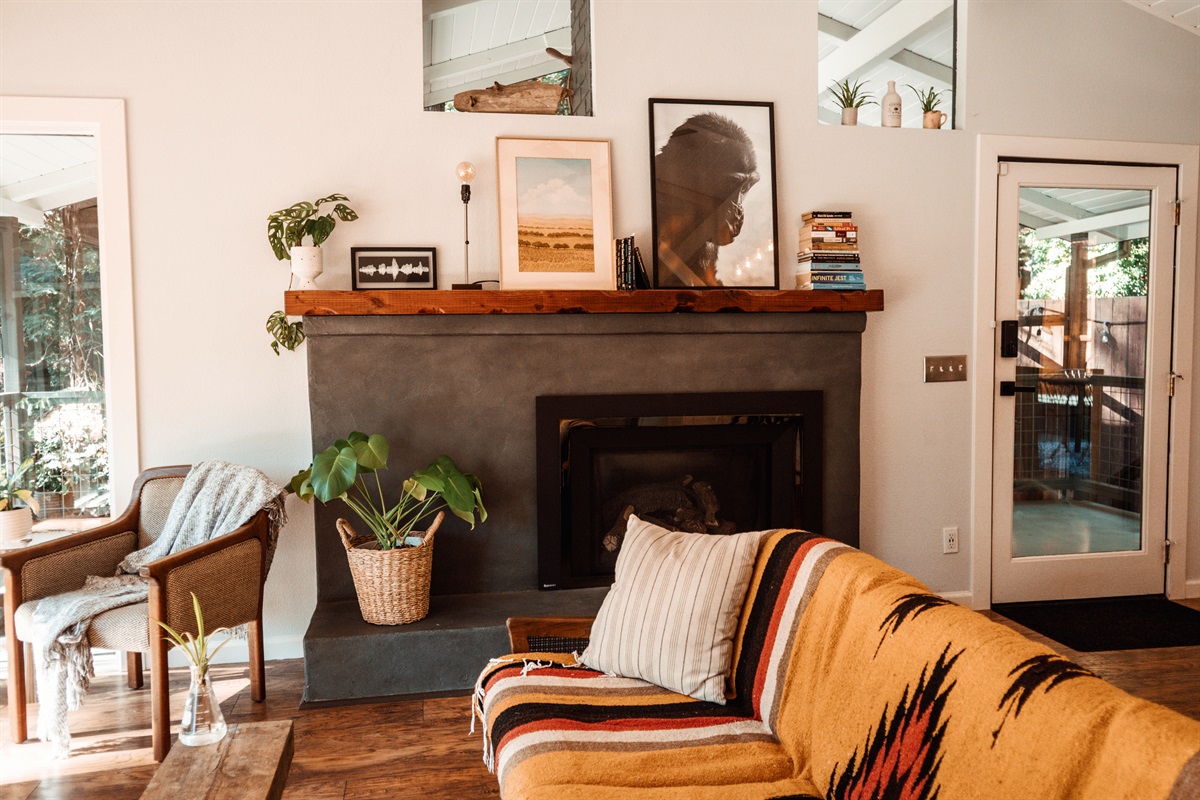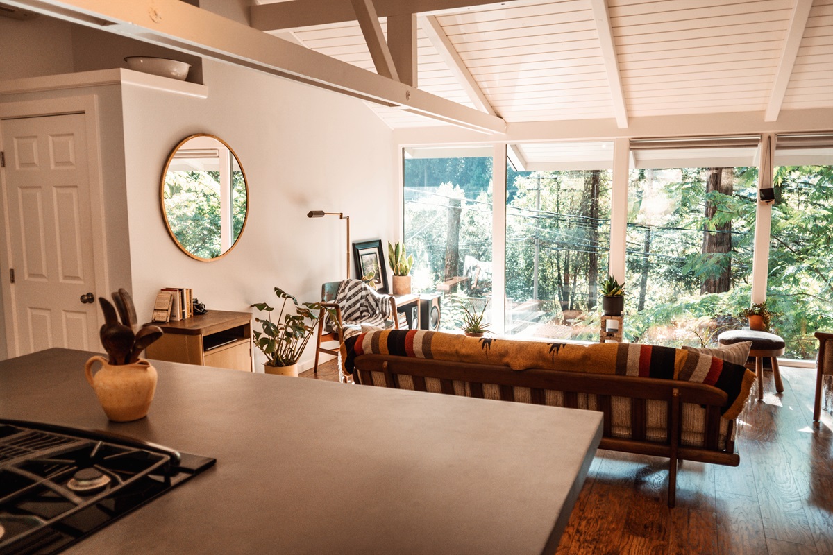 Step into a bright, airy living space designed for relaxation, romance, and inspiration. The open-concept interior combines modern finishes with curated vintage flair, while large windows fill the home with natural light throughout the day. Cook meals in the updated kitchen, unwind in the cozy living area, or enjoy a peaceful retreat in the queen bedroom after soaking in the hot tub under the stars. Whether you're here for work or play, the high-speed Wi-Fi supports streaming, video calls, and remote work among the trees.