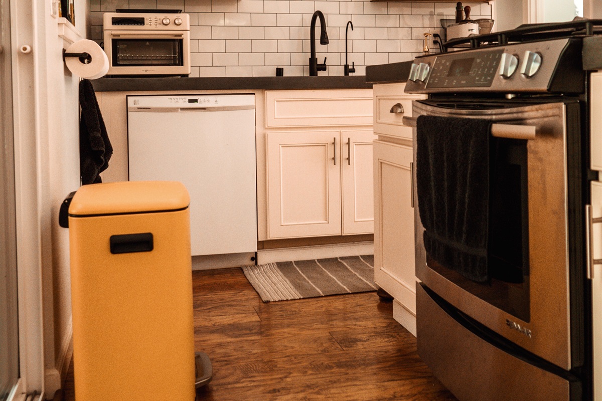 Modern kitchen with stove/oven, dishwasher, microwave, and coffee maker