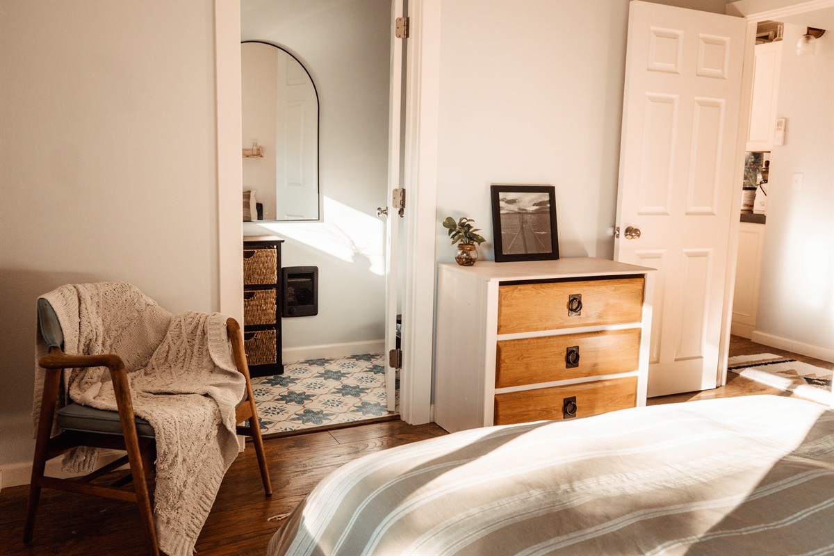 Plush queen-size bed + spa-like full bathroom